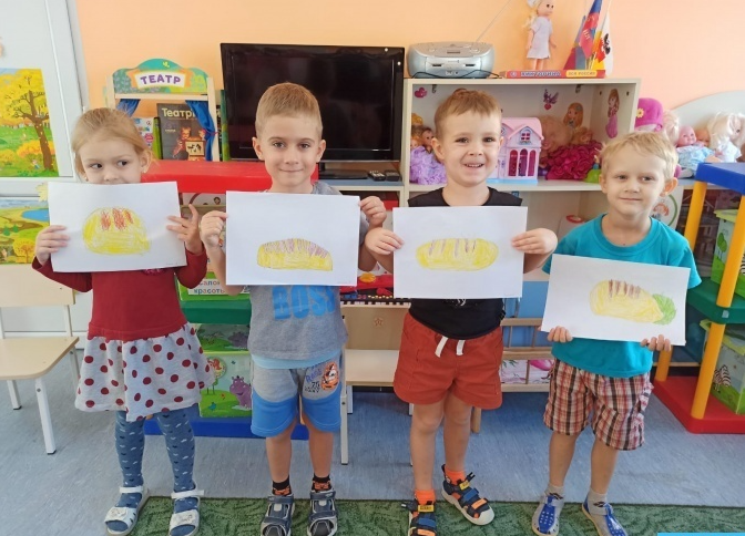 Рисование: учить детей изображать батон максимально достоверно и аккуратно на всей поверхности листа.