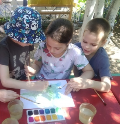 Дети раскрашивают листы бумаги красками, на них проявляется рисунок. Это подсказка к следующему испытанию, ориентируясь по карте команды находят нужное место.