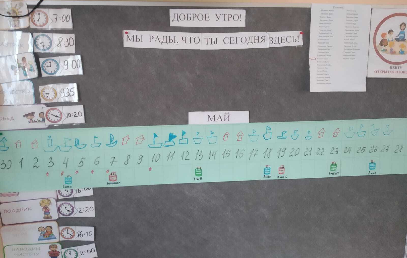 Очень понравился нашим ребятишкам «Утренний и вечерний круг», когда мы уютно усаживались на ковре. Утром приветствуем друг друга, а вечером обсуждаем планы на завтрашний день. Постепенно в обсуждения стали включаться ребята, которые сначала были просто пассивными наблюдателями. Во время «Утреннего круга» мы начали внедрять «Линейный календарь».