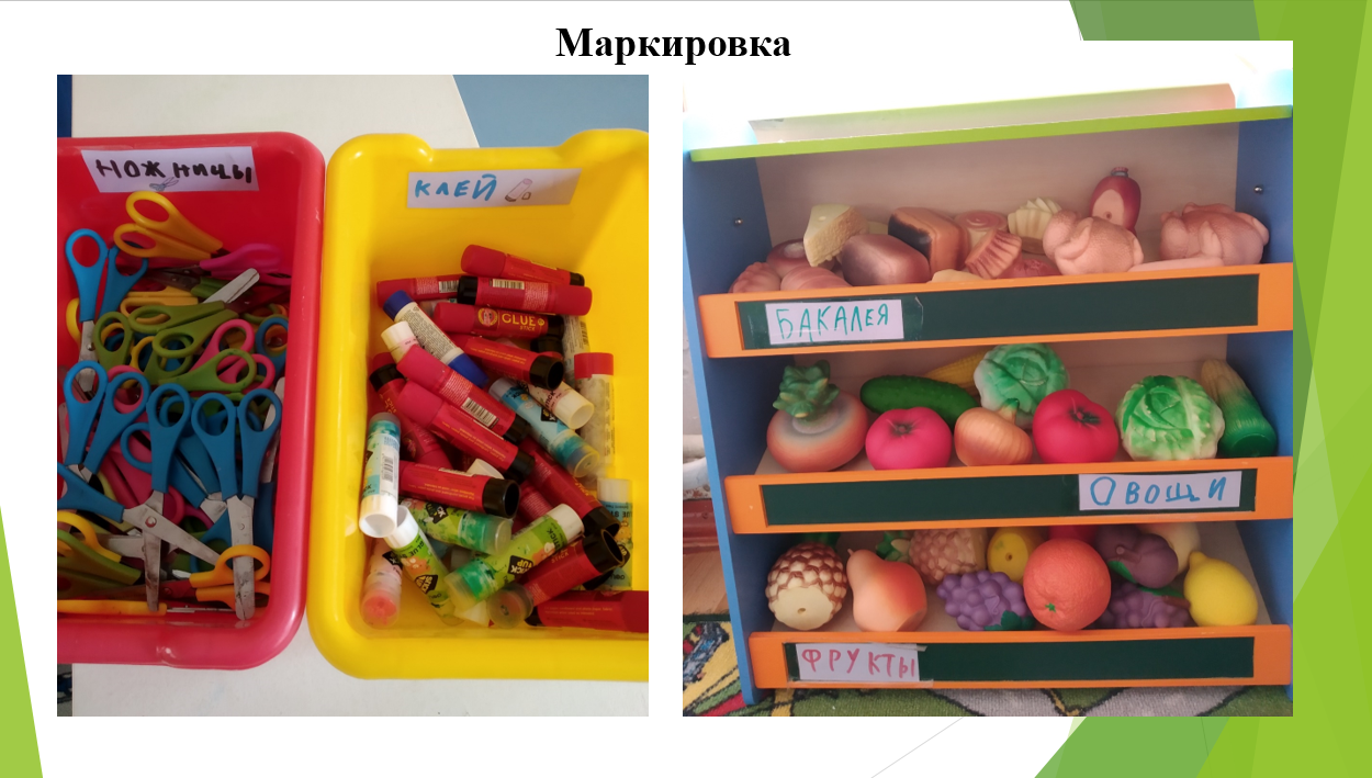 Разделение центров организовано с помощью передвижных полок. Каждый центр промаркировали по цвету, дополнили эмблемой-картинкой и подписали.