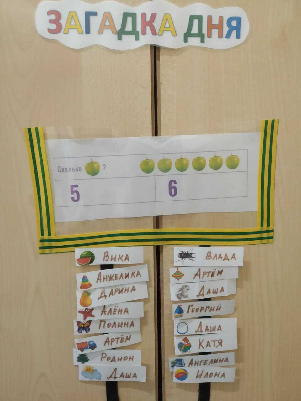 Следующей технологией была «Загадка дня». Она поселилась на магнитной доске. Место, где расположить стенд с загадкой, ребята нашли сами, они сказали, что «надо её (загадку) видеть со всех сторон». Уже на следующий день дети самостоятельно подходили к загадке, обсуждали её и отгадывали.