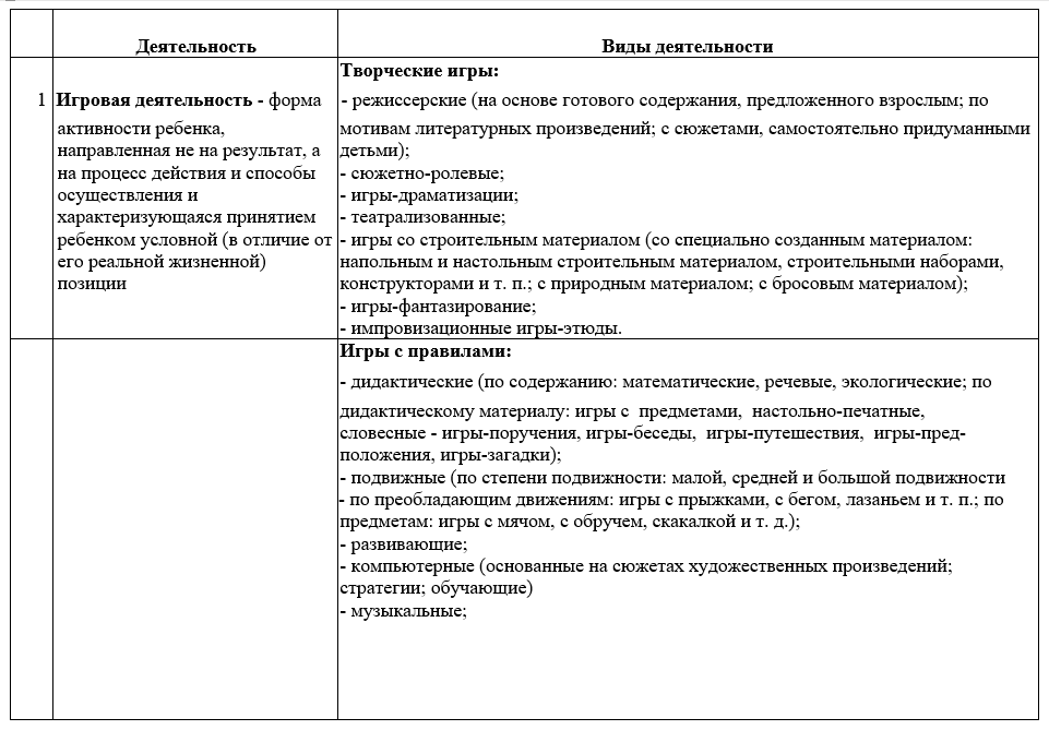 Существуют разные варианты классификации видов детской деятельности, каждая примерная образовательная программа дошкольного образования определяет наиболее существенные для реализации представленного в ней содержания виды и формы детской деятельности.